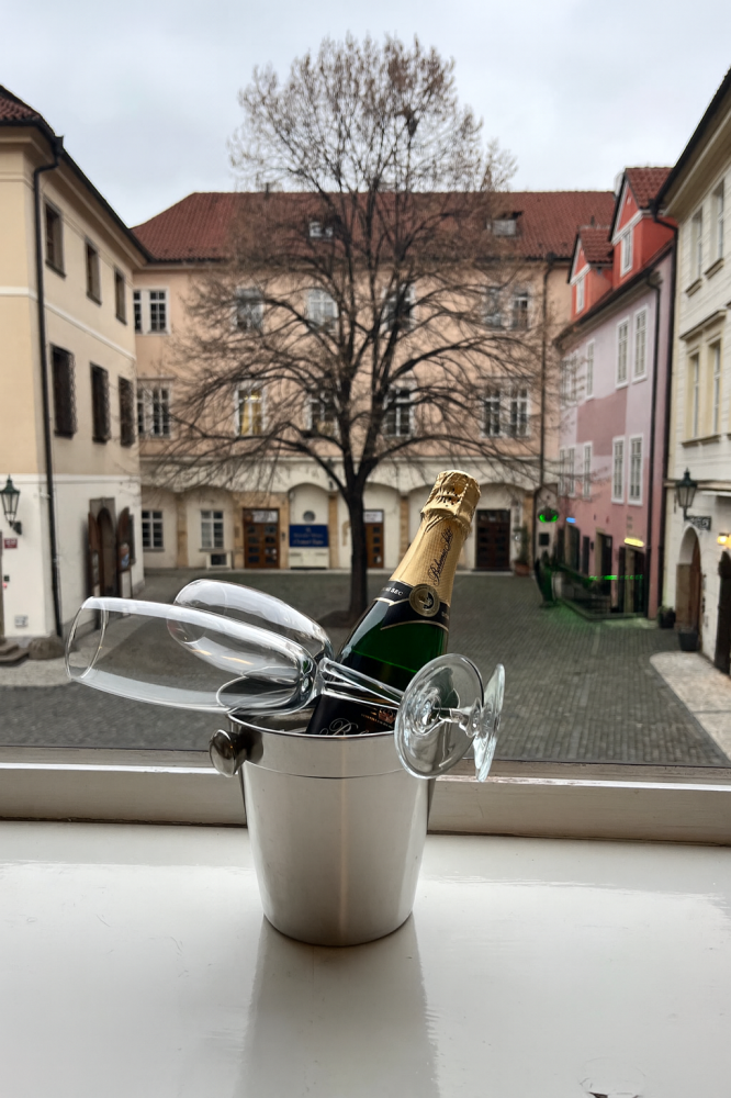 Má malou terasu s krásným výhledem na Týnský chrám.